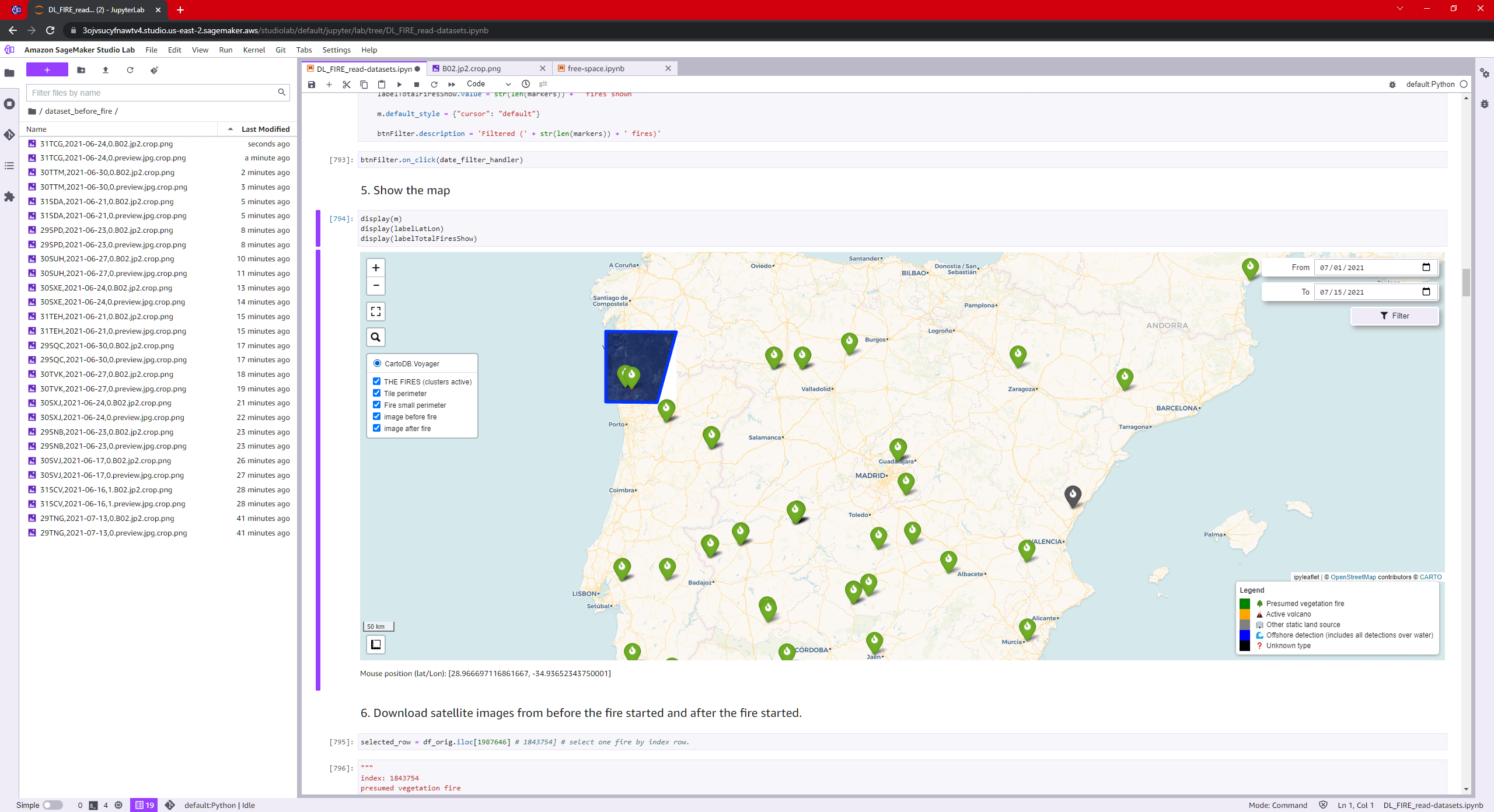 La idea que he presentado consiste en leer un dataset de incendios geolocalizados, descartar las zonas urbanas/industriales para quedarse con los incendios forestales. A continuación descargamos automáticamente las imágenes de satélite Sentinel-2 de los instantes previos al inicio del incendio, y las recortamos para quedarnos solo con el trozo que se quemará. Después, utilizamos una red neuronal (Vision Transformer, ViT), para intentar entrenarla para que clasifique entre «zonas que potencialmente se quemarán en el futuro» y «zonas que potencialmente no se quemarán».